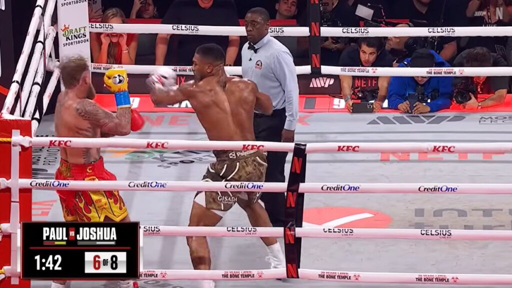 Pe ringul din Kaseya Center, Anthony Joshua, fost campion mondial WBA-WBO-IBF la categoria grea, a încheiat lupta în runda a șasea, cu un croșeu de dreapta la bărbie care l-a trântit definitiv pe Jake Paul la podea. În runda anterioară, youtuberul devenit boxer fusese deja doborât de două ori, ceea ce a subliniat puterea rivalului său englez.